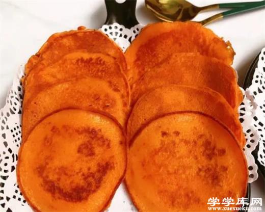 6. 同時,熱鍋加熱,刷上少許油,將A號面糊舀入鍋中,倒入中心位置,讓面糊自然流淌,成小圓餅狀。翻面煎炸,多次翻動,制作出香噴噴的西紅柿蛋餅。