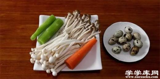 1. 準備白玉菇、蟹味菇、萵筍、胡蘿卜、鵪鶉蛋、大蒜、鹽、水淀粉。
